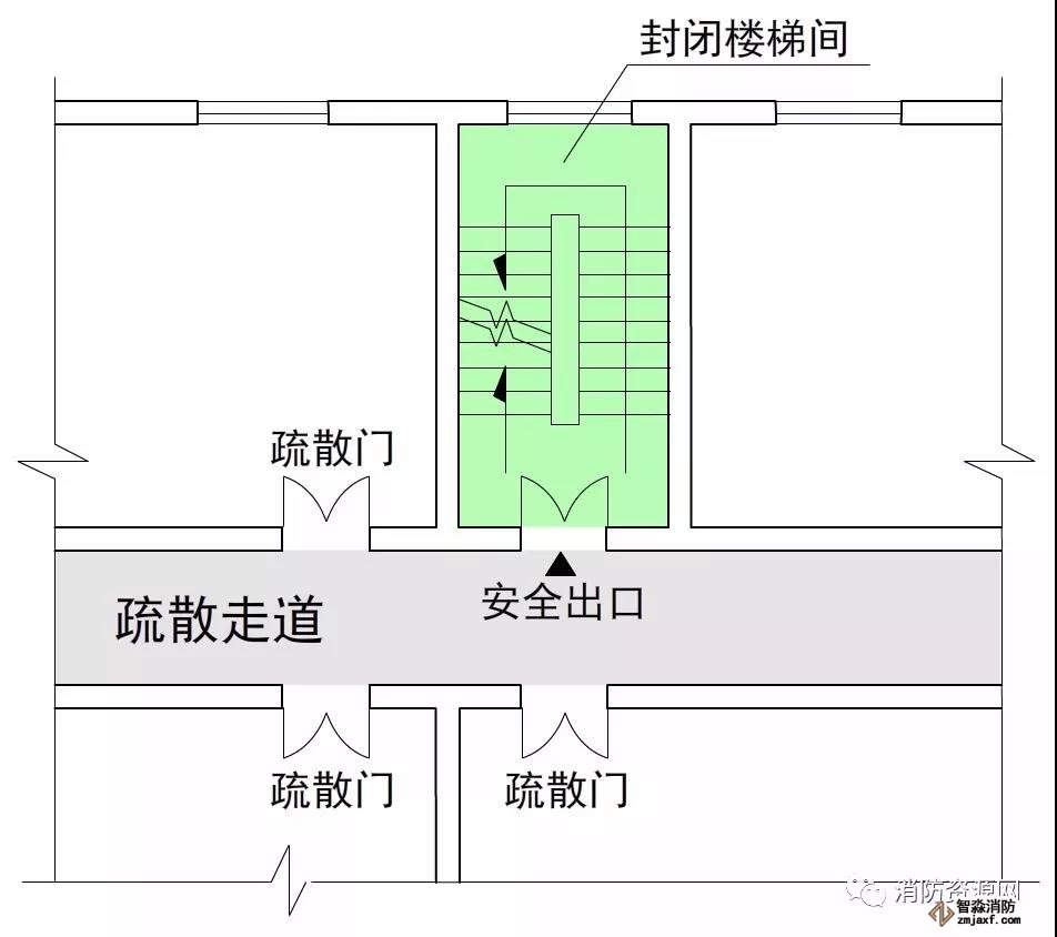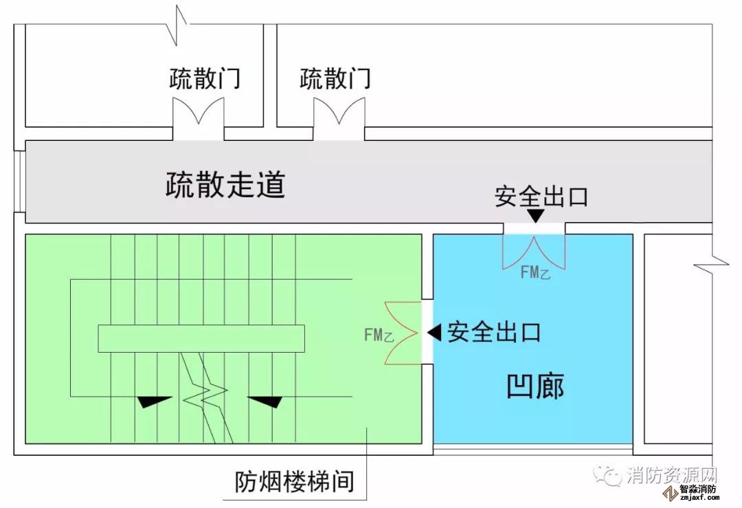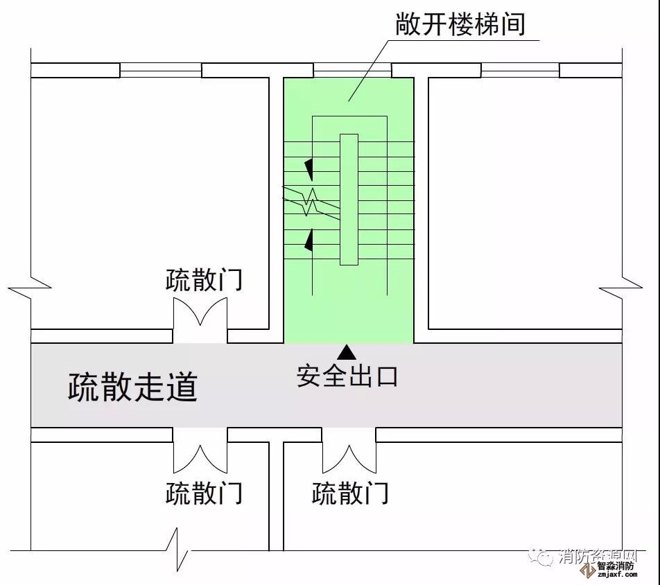 疏散樓梯間、防煙樓梯間的前室、室外樓梯以及符合要求條件的連廊和天橋等,通常認為是相對安全的區域,火災條件下人員進入這些區域,即可認為到達安全區域。因此,這些區域的入口通常稱為安全出口,比如敞開樓梯間的出口、封閉樓梯間的門、防煙樓梯間的前室門,室外疏散樓梯的出口,符合條件的連廊和天橋出口,以及直接通向室外安全區域的房門等,這些出入口均屬于安全出口。