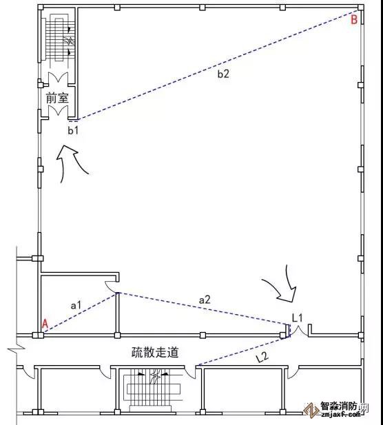 如圖示一所示:B點至安全出口的疏散距離為(b1+b2),A點至安全出口的直線距離包括A點至疏散門的直線距離(a1+a2)和疏散門到安全出口的直線距離(L1+L2)。