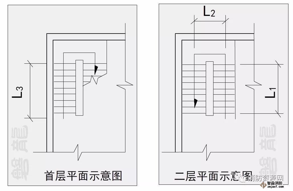 如圖所示的室內雙跑樓梯,梯段和休息平臺部份的疏散距離為L=1.5×L1+L2+1.5×L3