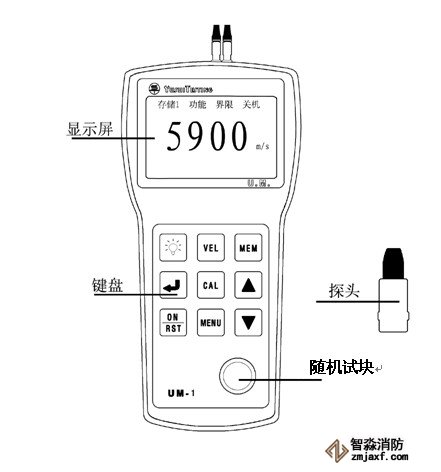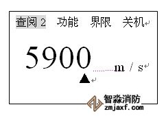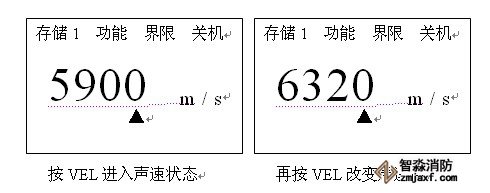 將探頭插頭插入主機探頭插座中,按一下ON鍵,聽到兩次蜂鳴聲屏幕出現顯示,其中顯示的聲速為上次關機前使用的聲速,顯示內容見下圖: