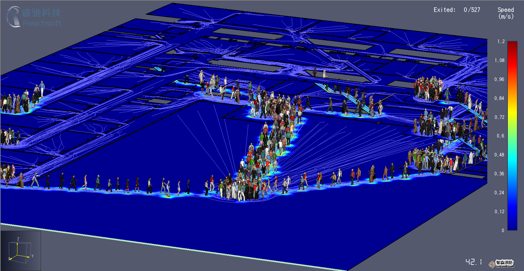 -Pathfinder還專門提供了高性能可視化的3D時間歷程模擬,利用透明化功能來更好地顯示密集人群在樓層中的疏散情況。